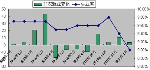 失業(yè)率由去年12月份的9.4%降至9.0%,低于市場預(yù)期的9.5%,大約有1386萬有就業(yè)意愿的美國公民未能找到工作。失業(yè)率為連續(xù)第二個月降低,但仍位于9%的高位。