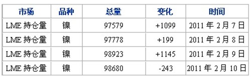 3.全球最大的鎳生產(chǎn)商俄羅斯NorilskNickel公司擬將今年鎳產(chǎn)量提高至30-31.5萬噸,該公司2010年的鎳產(chǎn)量為297,329噸,同比做多增長5%。