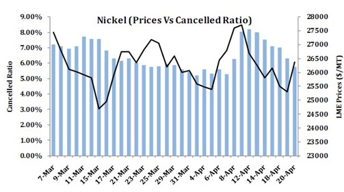 金川集團(tuán)鎳板出廠價緊隨市場變化,4月19日下調(diào)4000元/噸至193000元/噸。其后,21日,22日,兩次上調(diào)出廠價4000元/噸至197000元/噸。周內(nèi),市場現(xiàn)貨鎳價累計(jì)上漲約1000元/噸,市場成交較上周有所好轉(zhuǎn)。